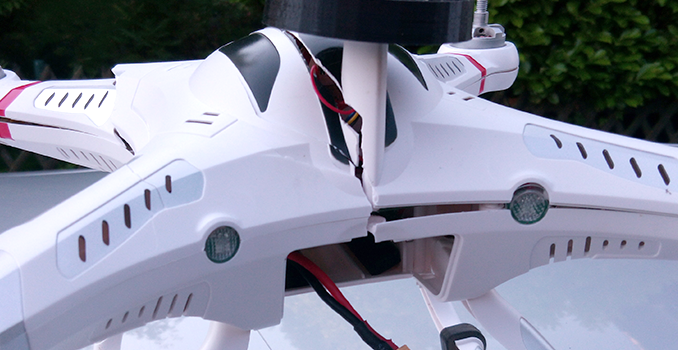 Gestern Abend dann nochmal einen Flug auf Video aufnehmen wollen um jemandem zu zeigen, wie ruhig ich ihn jetzt durch sehr genaue Kalibrierung bekommen habe. Schönen Punkt zum Start ausgesucht, Akku angeschlossen, gewartet bis sich das GPS gefunden hat und dauerhaft grün leuchtet. Dann den Gas-Hebel wie bei jedem Start auf ca. 70% und der Copter startet wie gewohnt zügig hoch. Auf einer Höhe von rund zwei Metern habe ich jedoch sämtliche Kontrolle verloren und er schoss wild in die Höhe und weg von mir! Sämtliche Eingaben an den Sticks wurden vom CX-20 einfach ignoriert. In der Panik habe ich diverse Einstellungen probiert um wieder die Kontrolle zu bekommen. Das endete dann in einem rasanten Absturz meines Copters… 🙁 Gehäuse ist an beiden vorderen Armen vollständig durchgebrochen, hinten hat es quer einen Riss. Ein Motor ist auch defekt. Vielleicht war er die Ursache? Ich werde es nie erfahren, da ich eine der weit verbreiteten Mini-APM mit defektem Log-Speicherchip habe. Das bemerkt man erst, wenn man seinen Totalschaden auslesen möchte…